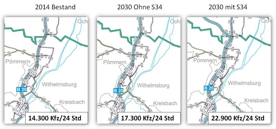 In der UVP zur S34 aus 2017 hat man an der nördlichen Stadteinfahrt von Wilhelmsburg in 2014 pro Tag 14.300 Autos gezählt. Die Prognose sieht für 2030 ohne weitere Ausbaumaßnahmen 17.300 Autos pro Tag rollen. Wenn die S34 gebaut werden sollte, prophezeit man allerdings 22.900 KFZ pro Tag.